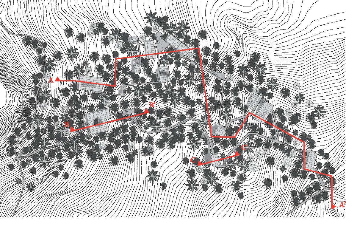 從長向剖面能展示不同的空間層次與連貫狀態,例如建築 體之間高度和體積的變化、開放和封閉的變化等,都針對活動做出不同的回 應方式及序列關係,也依據地形去調整空間的節奏。如此層次和連貫性不只是單一的元素組合,而是將建築、活動與環境等多個要素結 合在一起,形成一個有機且具有流暢性的空間體驗,最 要的是它激發使用者對於探索和發現的渴望。