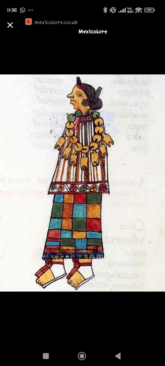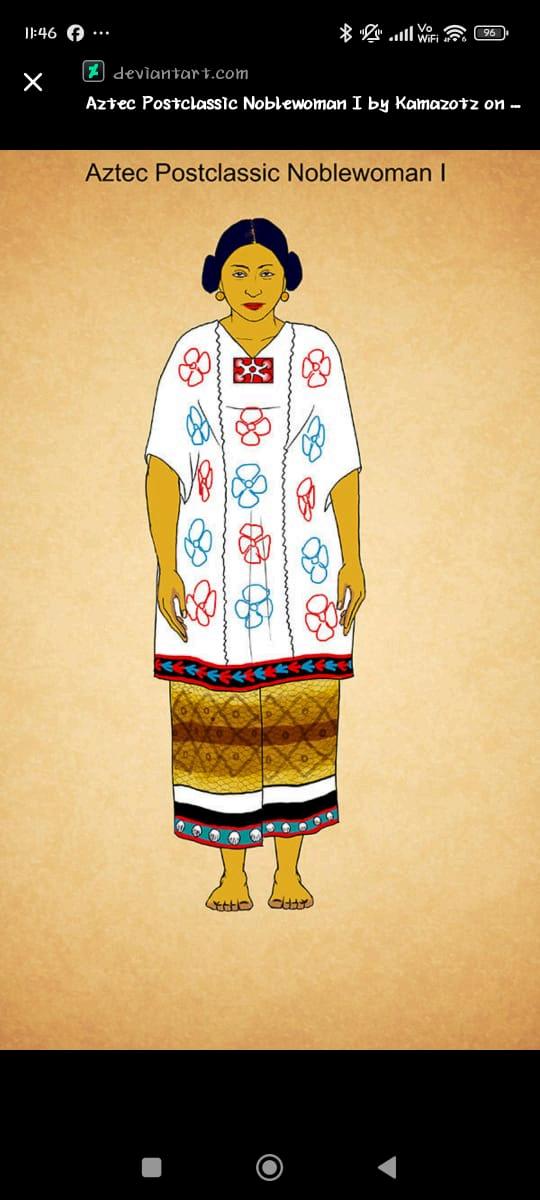 In the late stage, women’s clothing became highly ceremonial and symbolic, particularly for nobles, warriors’ families, and those participating in ritual events in the Aztec Empire. Huipils and cueitl skirts were richly dyed, often embroidered with elaborate patterns, or adorned with feathers, beads, and precious materials. The tilmatli cloak became larger, more colorful, and intricately decorated, clearly indicating noble or ceremonial status. Jewelry and accessories were highly elaborate, including ear spools, bracelets, necklaces, chest pectorals, belts, and even back banners (pamitl). These garments were not only functional or decorative but also communicated social rank, achievements, and cultural identity. The late stage illustrates the evolution of clothing from simple daily wear to complex ceremonial attire that integrated artistry, symbolism, and social hierarchy.