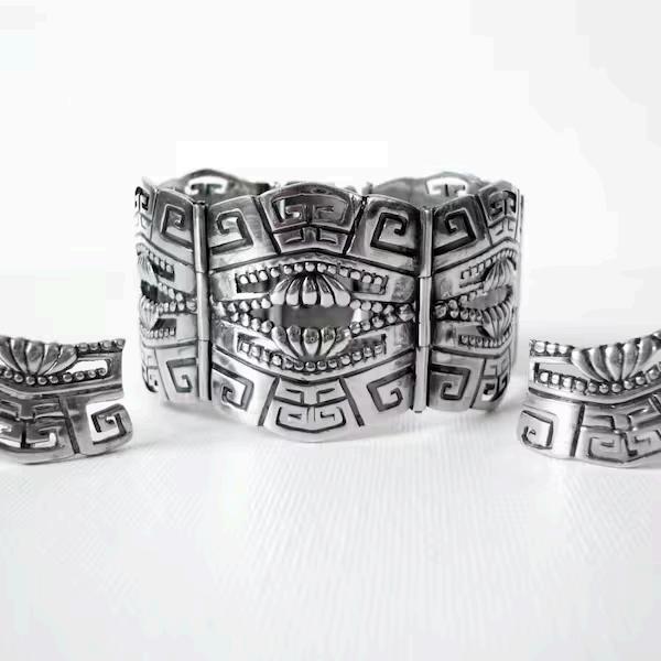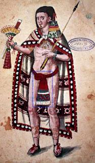In the late stage of the Pre-Hispanic period, men’s clothing became highly ceremonial and symbolically rich, especially among nobles and warriors. The maxtlatl was often richly dyed or patterned, and the tilmatli cloaks were large, colorful, and decorated with feathers, embroidery, or precious materials. Footwear (cactli) was sometimes elaborately designed. Jewelry and ornaments reached their most complex forms, including ear spools, bracelets, pectorals, belts, and back banners (pamitl), which conveyed rank, achievements, and affiliation with specific communities or military orders. This stage emphasizes the importance of clothing as a marker of identity, status, and ritual function, while practical workwear was still used by commoners and laborers.