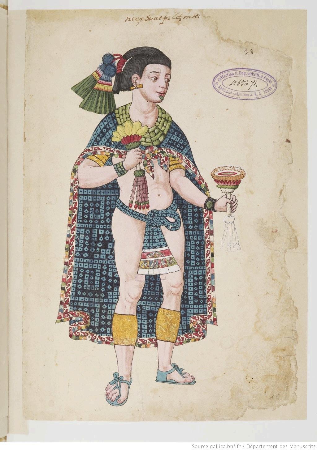 The tilmàtli was a rectangular cloak or cape worn by men in pre-Hispanic Mexico, draped over one shoulder and fastened with a knot. Made from cotton for nobles or coarse maguey fiber for commoners, it signified social status and could also serve practical purposes, like carrying items. The tilmàtli was often worn over the máxtlatl (loincloth) and sometimes decorated with patterns or colors to indicate rank, achievements, or ceremonial importance.