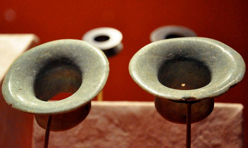 Ear spools made from jade, shell, or stone were worn by elite men as markers of status. Their size and material reflected wealth and lineage, and they appear frequently in Maya and Aztec imagery.