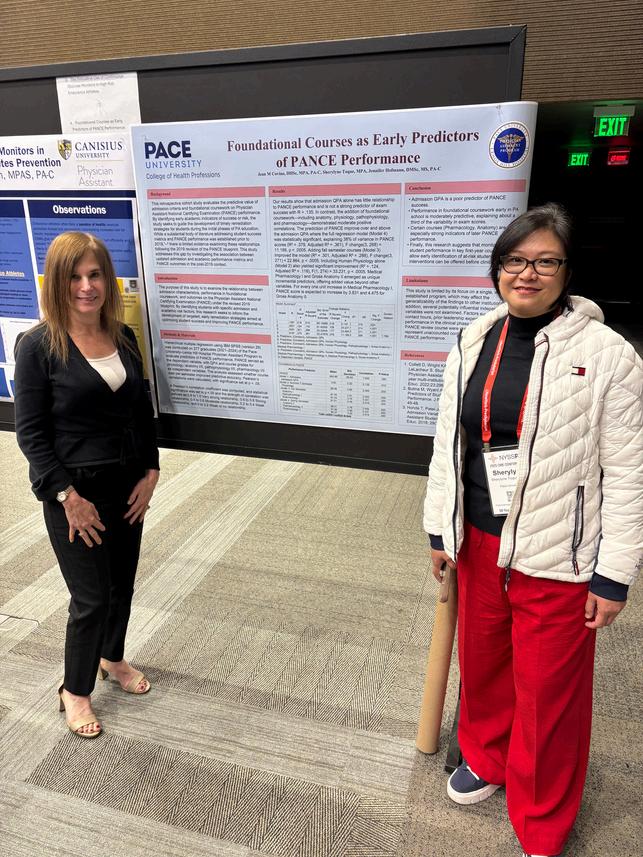 Jean M. Covino, DHSc, MPA, PA-C, and Sherylyne Toque, MPA, presented a joint poster, Foundational Courses as Early Predictors of PANCE Performance at the New York State Society of Physician Assistants conference, sharing their work with colleagues from across the state and contributing to ongoing dialogue and scholarship within the PA community.
