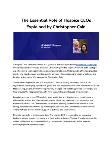 Chris Cain Hospice has spent almost 30 years working in long-term care and hospice services. Over this time, he has held senior positions, managing hiring, training, team leadership, patient care standards, financial management, marketing, regulatory processes, and business operations. He has been instrumental in starting multiple assisted living centers, hospice agencies, and a hospital. As CEO, CFO, and Administrator of St. Gabriel’s Hospice & Palliative Care, he built a model focused on “People Caring for People.” He and his team provided care that included not only symptom management but also attention to patients’ emotional and spiritual needs. Since 2012, he has led the growth of St. Gabriel’s into a 300-patient hospice agency with more than 200 employees across Texas cities, including Fort Worth, Dallas, Austin, San Antonio, Lubbock, Houston, San Angelo, Corpus Christi, and Tyler. His responsibilities include budgeting, human resources, recruitment, operations planning, accounting, and sales management. Before this role, Chris Cain Fort Worth served as Regional Director of Operations at a management company, overseeing four Alzheimer’s care communities in North Texas. There, he increased the census by 14% in the first quarter, achieved a net operating income of over 90% in most locations, and stabilized staffing and expenses. Earlier, he served as the CEO of a Medicare-certified hospice agency, where he achieved profit margins in the 20% range, broke even within eight months, expanded to care for 100 patients, and opened new locations in San Antonio and Austin. Chris Cain, Clear Fork Group, also served as Executive Director, Area Director of Sales and Marketing, Marketing Representative, and Hospital Administrator. In these positions, he guided hospital construction, developed referral relationships, led teams across multiple states, and consistently exceeded performance targets. Chris Cain Hospice earned a Master of Business Administration and a Bachelor of Science in Gerontology.