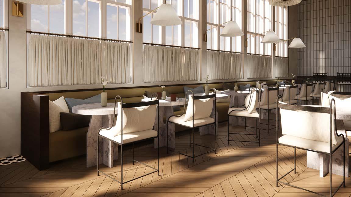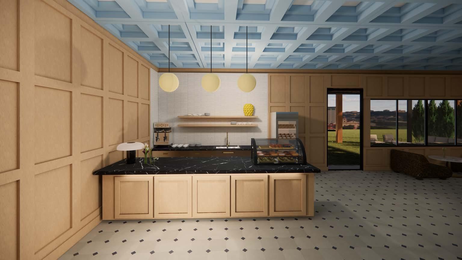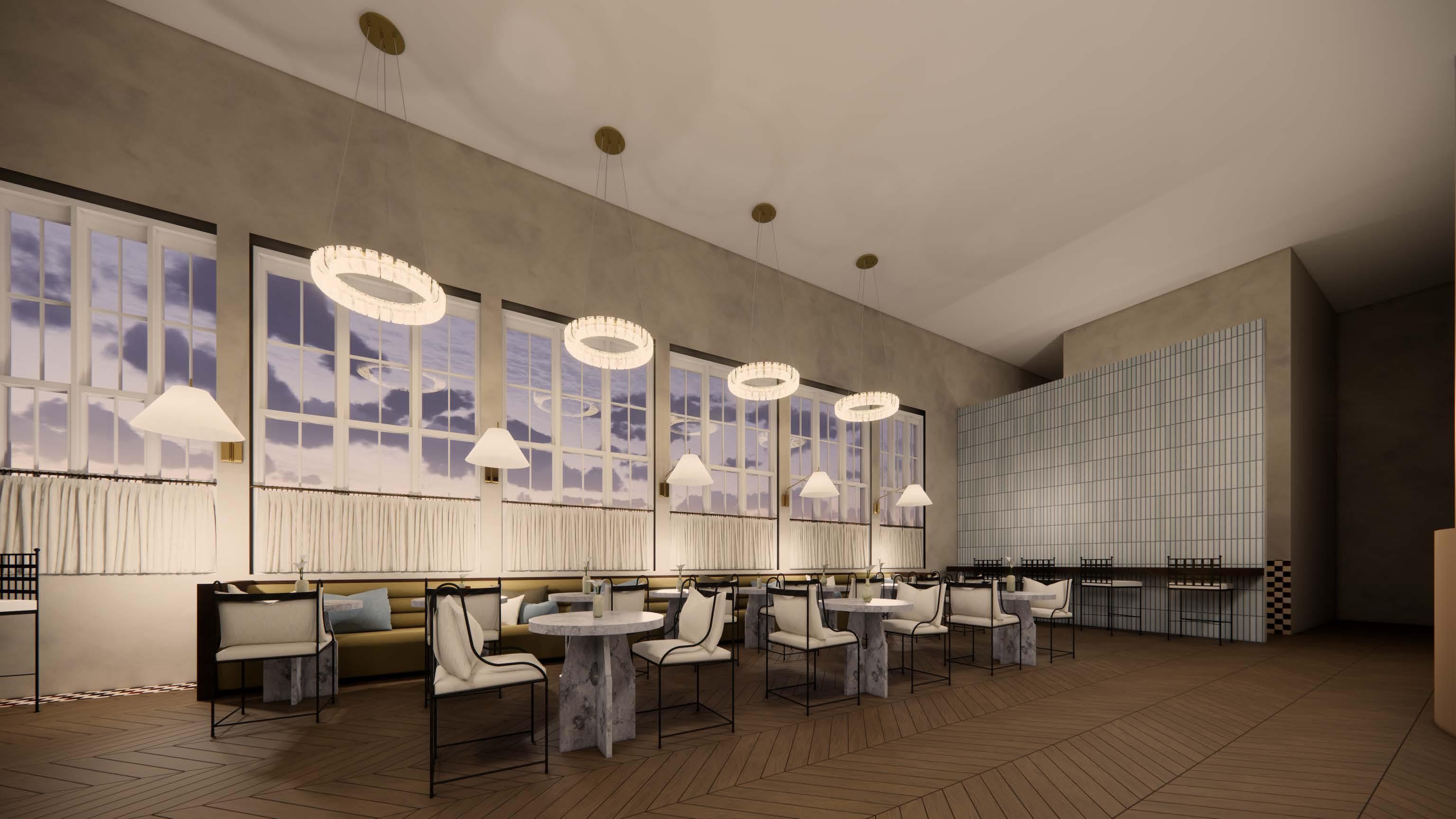 The Coast Cafe and Bakery captures the atmospheric beauty of a foggy San Francisco morning overlooking the Golden Gate Bridge, blending a warm and welcoming coastal aesthetic with sleek modern elements. The color palette— anchored by deep red, fog grey, and soft neutrals—echoes the city’s iconic skyline as seen through coastal mist. Walls in a muted fog grey create a calming, cocoon-like envelope, while warm wood tones and off-white accents in furnishings add visual warmth and natural texture. Deep red is used sparingly but deliberately in details, and decorative accents, offering a rich contrast and nod to the Golden Gate’s structure. The flooring is a sand-toned oak,groundingthespaceinanaturalcoastalfoundation.