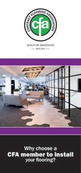 Tel: 0115 941 1126 www.cfa.org.uk Email: info@cfa.org.uk Specifying a CFA member for your next flooring project could mean the difference between success — or a flooring failure. Most of the UK’s largest and best known Manufacturers, Distributors, Contractors and Consultants are CFA members — and for good reason. • CFA members promote high standards, knowledge and expertise • CFA members will maximize your investment and minimize costly flooring failures — which is good for your client, good for your reputation and also helps promote future business • All members have to pass a vetting process See the “Downloads” section at www.cfa.org.uk and download our leaflet TODAY Specify CFA Members_Sep 2021_HP_all sizes.indd 2 24/09/2021 16:25:00