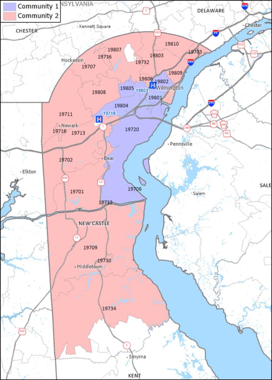 1” (zip codes 19801, 19802, 19804, 19805, and 19720) and “Community 2” (all other zip codes). This distinction was made to ensure the significant needs more prevalent in Community 1 were not overshadowed by county level statistics.