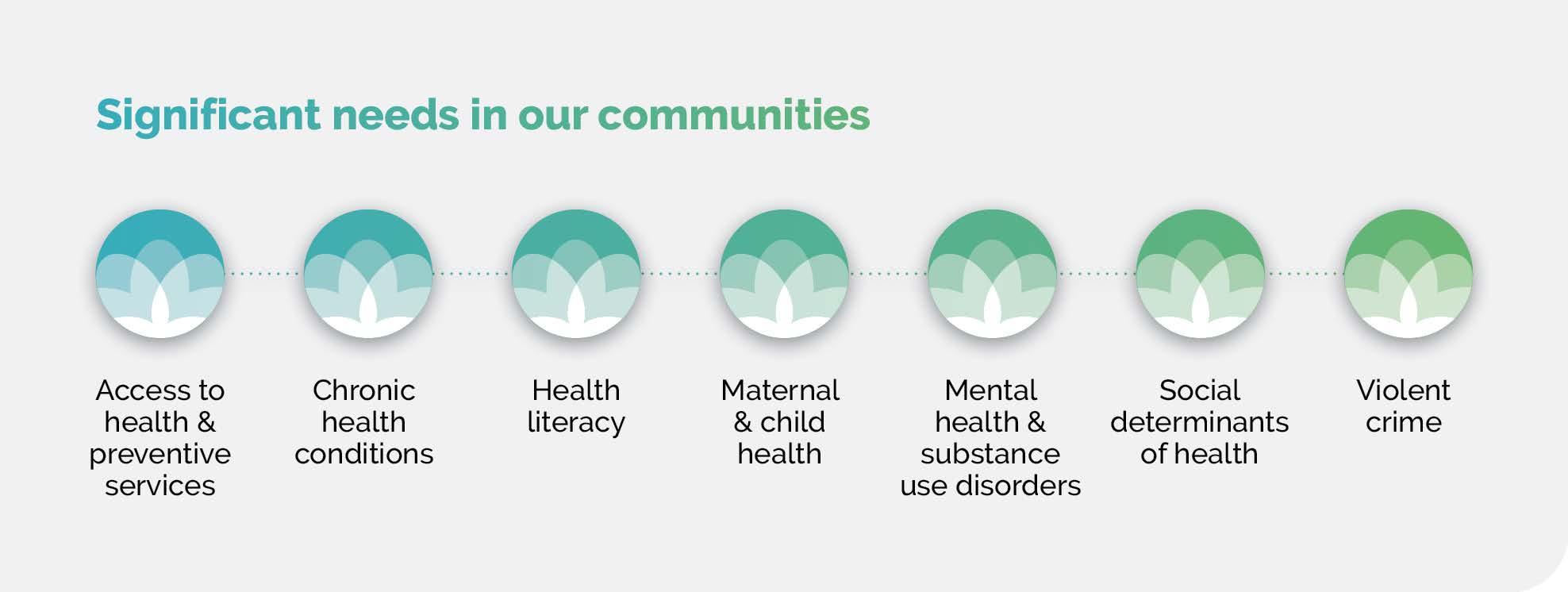 We also recognize the considerable overlap among the needs identified by our community. Social drivers of health are non-medical factors that contribute to – if not determine – a person’s health and well-being. Health literacy and violent crime are social drivers of health. Access to health and preventive services and health literacy are also overarching needs that drive poor health outcomes related to chronic conditions, mental health and substance use disorder, and maternal and child health.
