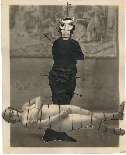 I’d like to talk about your interventions on the images. In some cases, you darken certain parts, and sometimes you add horned figures. Some of these black horned human shapes are added, while at other times they seem to take over people already present in the photograph. What do they represent for you?