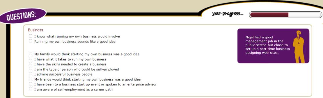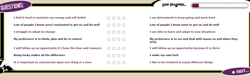 on the dimensions of the entrepreneurial activity and might help the participant identify her strengths and weaknesses.