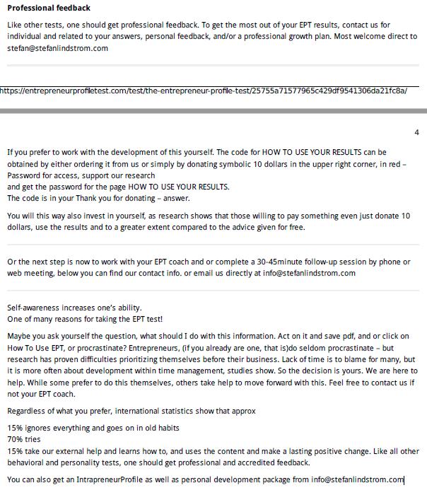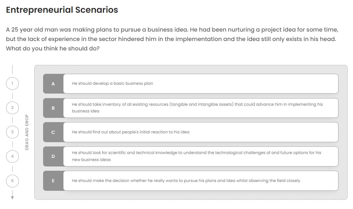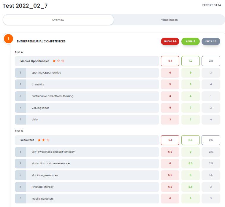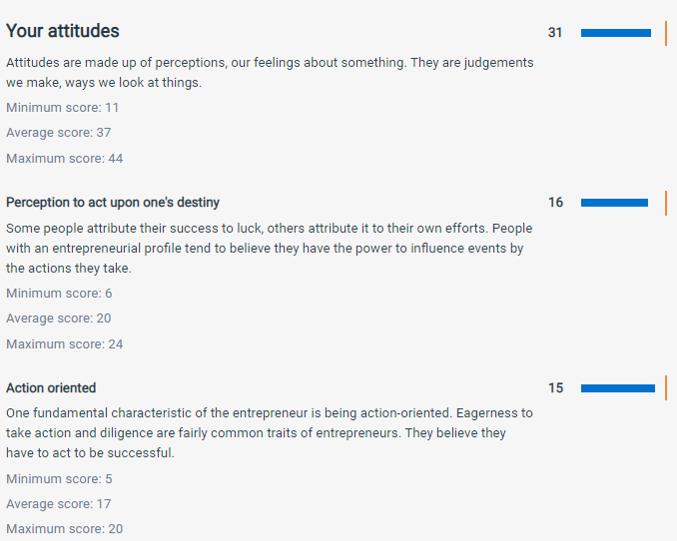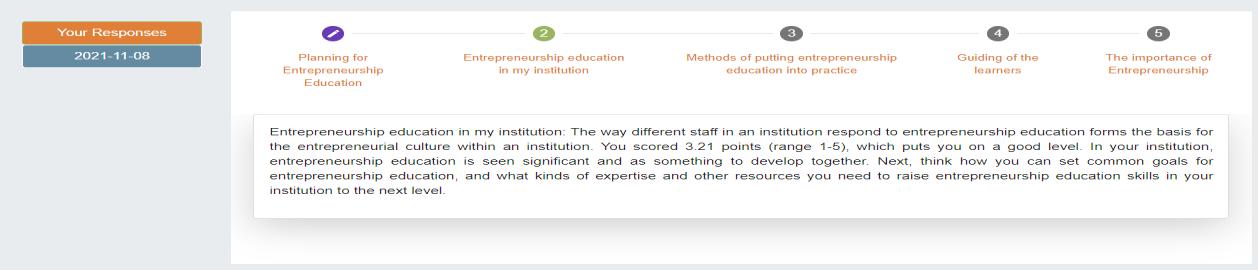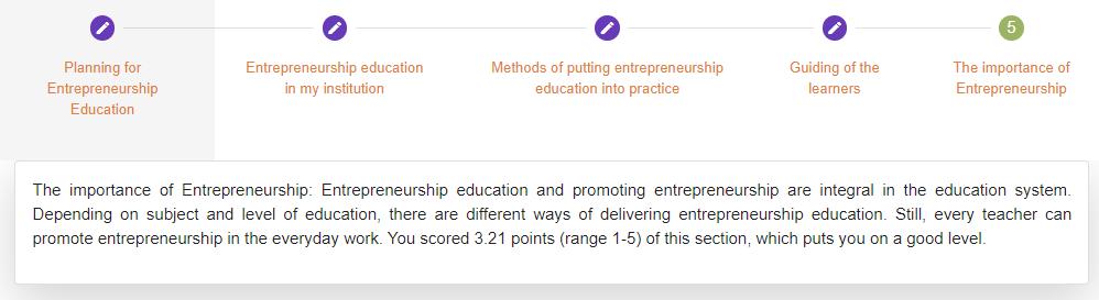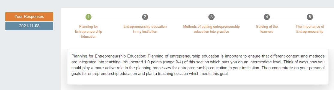All the assessment tools show the results and feedback to the participants in the form of a general score and, if applicable, a score for several subdimensions of the survey, plus comprehensive explanations. This is found to be a good practice in many aspects. First, the participant gets feedback on their entrepreneurial scores, although it might not be very precise due to the lack of survey validation and potential biases. A second benefit for the user is that she is able to understand the factors of the assessment tool, such as in “Ideas and Opportunities”, “Resources” and “Into Action”, in the case of EPIC. This allows the user to reflect