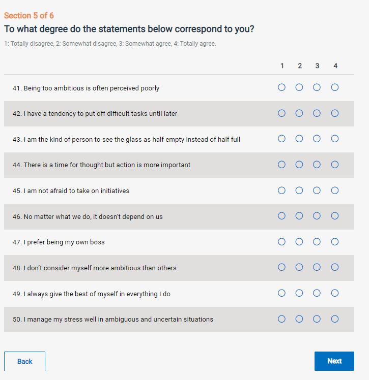 Most of the assessment tools that we reviewed use self-assessment statements, where the participant perceives herself as having a particular trait, skill or knowledge to some degree, often via a Likert scale. With this type of question, there is the risk that participants do not answer honestly, since it is well-known that biases can influence the participants’ answers (e.g., the willingness to present a positive image towards oneself or towards others). To prevent such biases, the assessment tools provide some tips such as “answer quickly”, “do not think too long”, “there are not right or wrong answers” and “answer honestly”. But this might be not enough to prevent optimistic biases.