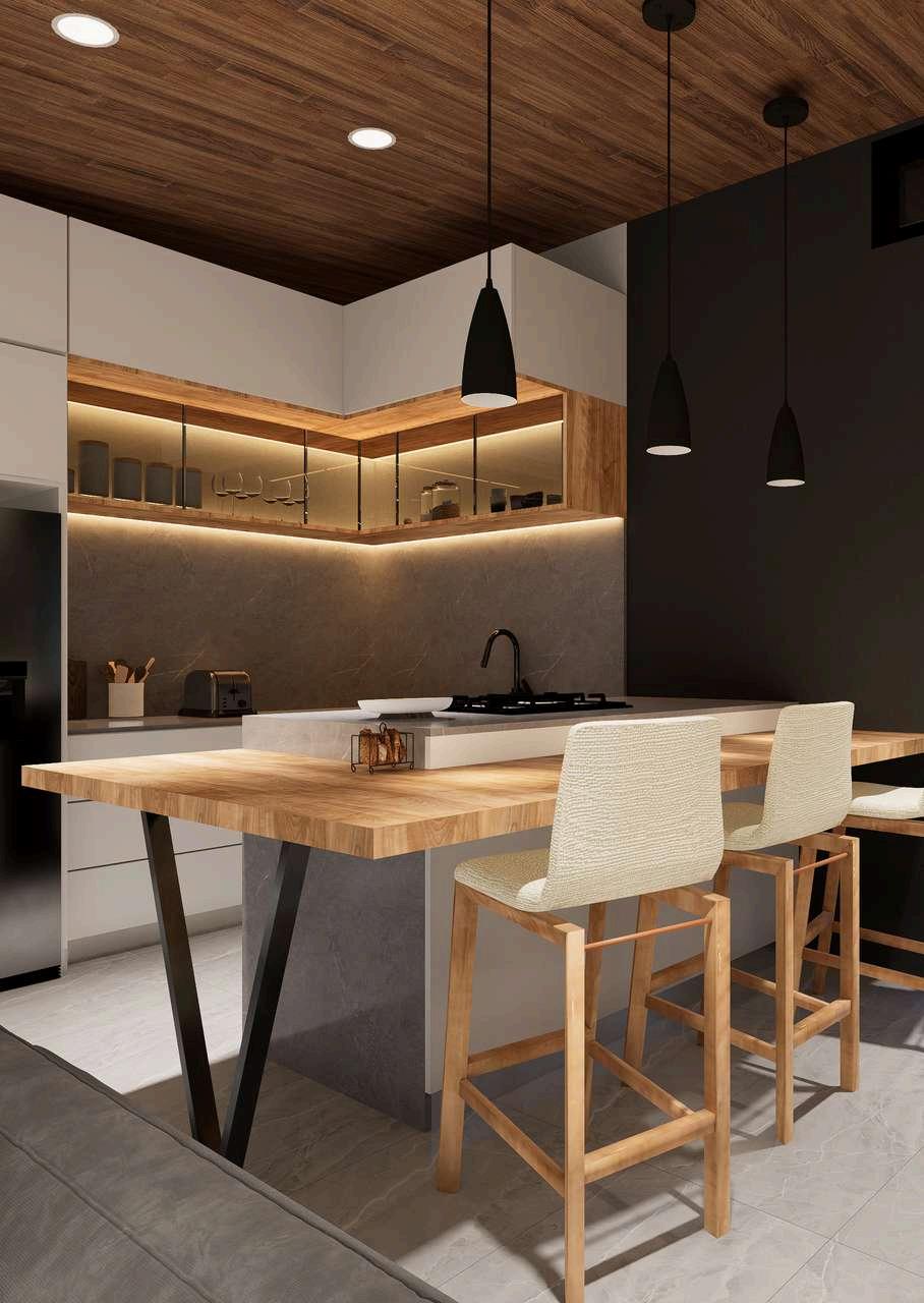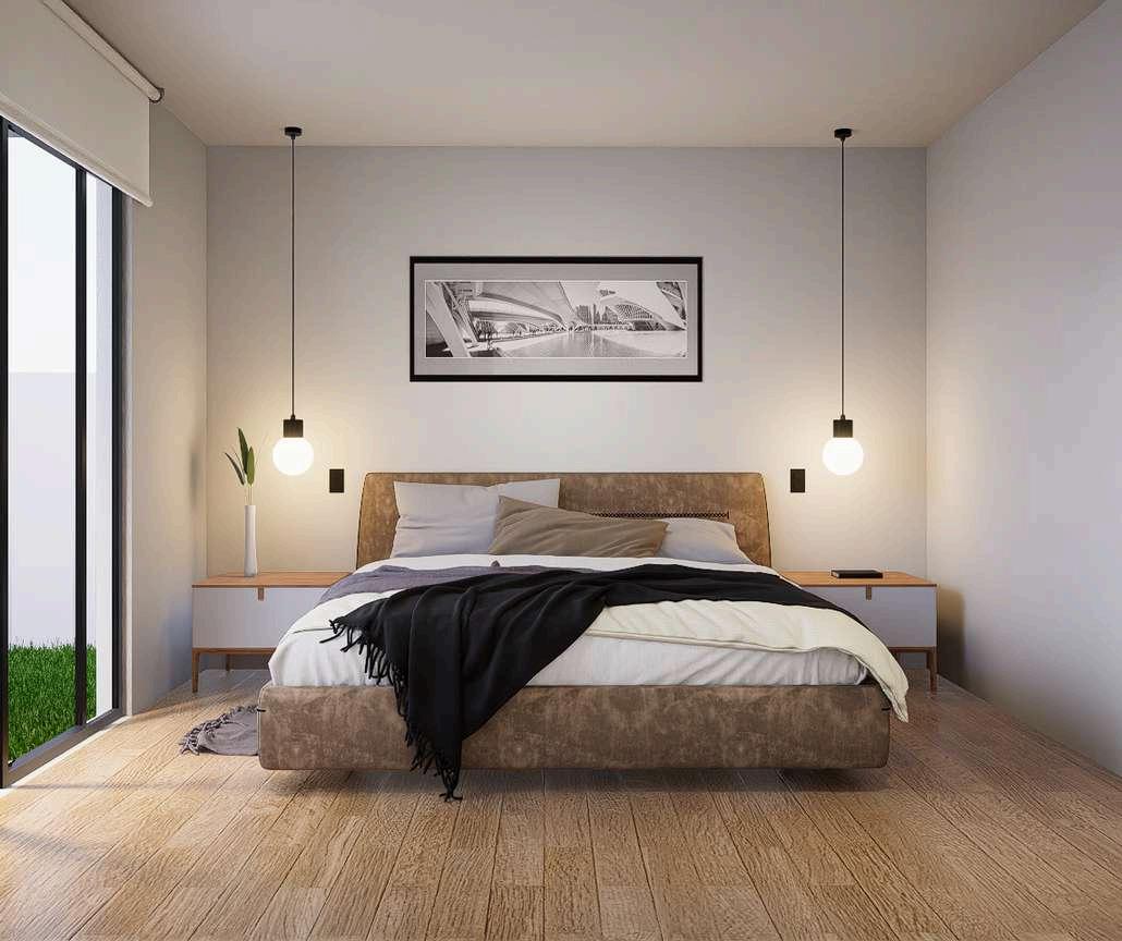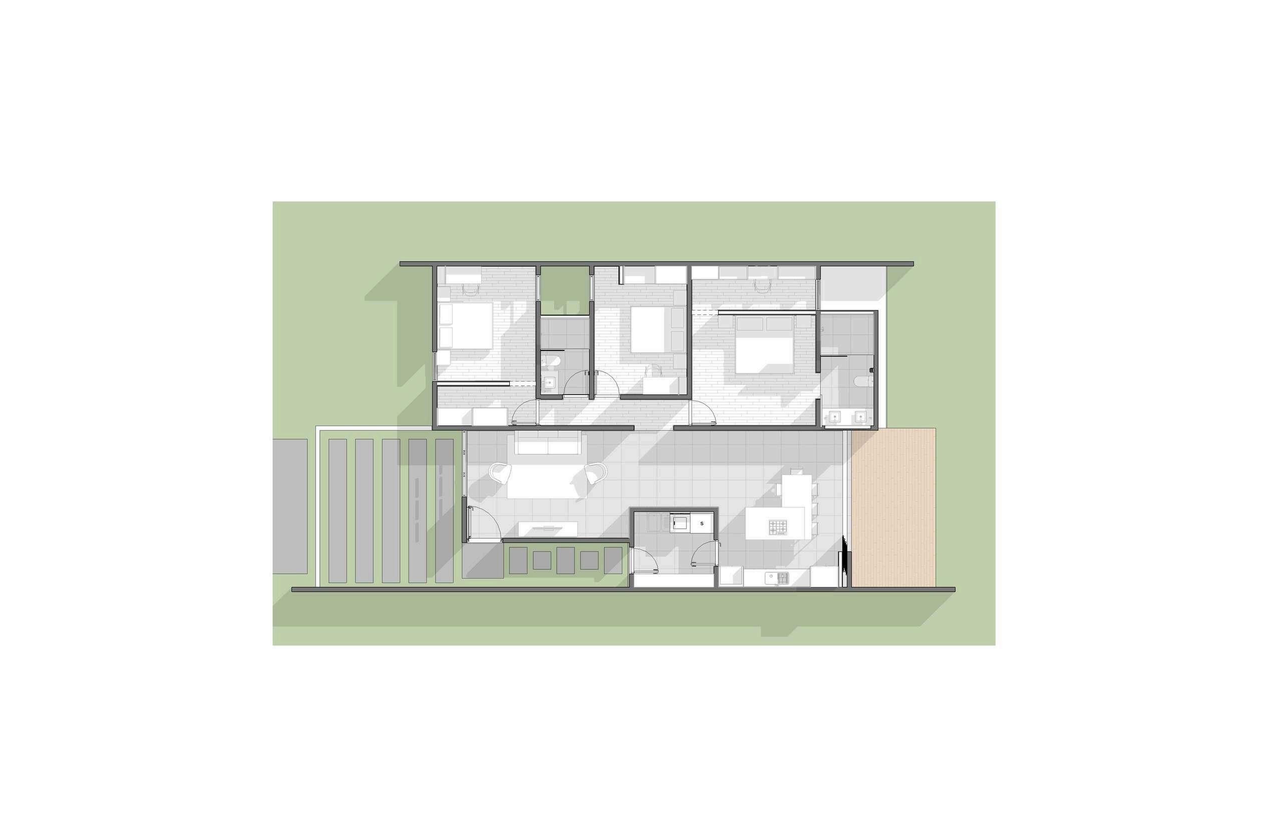 Este diseño corresponde a una vivienda unifamiliar en un condominio de alta categoría, cuenta con dos niveles; en el primero se encuentra el acceso vehicular y peatonal, una oficina, baño completo para visitas, cocina, comedor, espacio de lavandería integrado a la alacena, además de la sala principal. En el segundo nivel se cuenta con una sala de tv, el dormitorio principal con w/c y baño privado, además de dos dormitorios secundarios y un baño compartido.