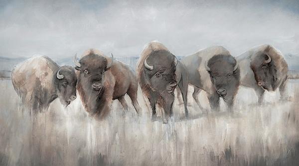 On the floor at the Buffalo Barn: a canvas print as a wall mural, the Davenport Floor Lamp, a customizable leather or fabric sofa with chaise, the Hadli Rug, Wynn’s Coffee Table, and the Sapphire Vase each piece selected for presence, texture, and timeless appeal.