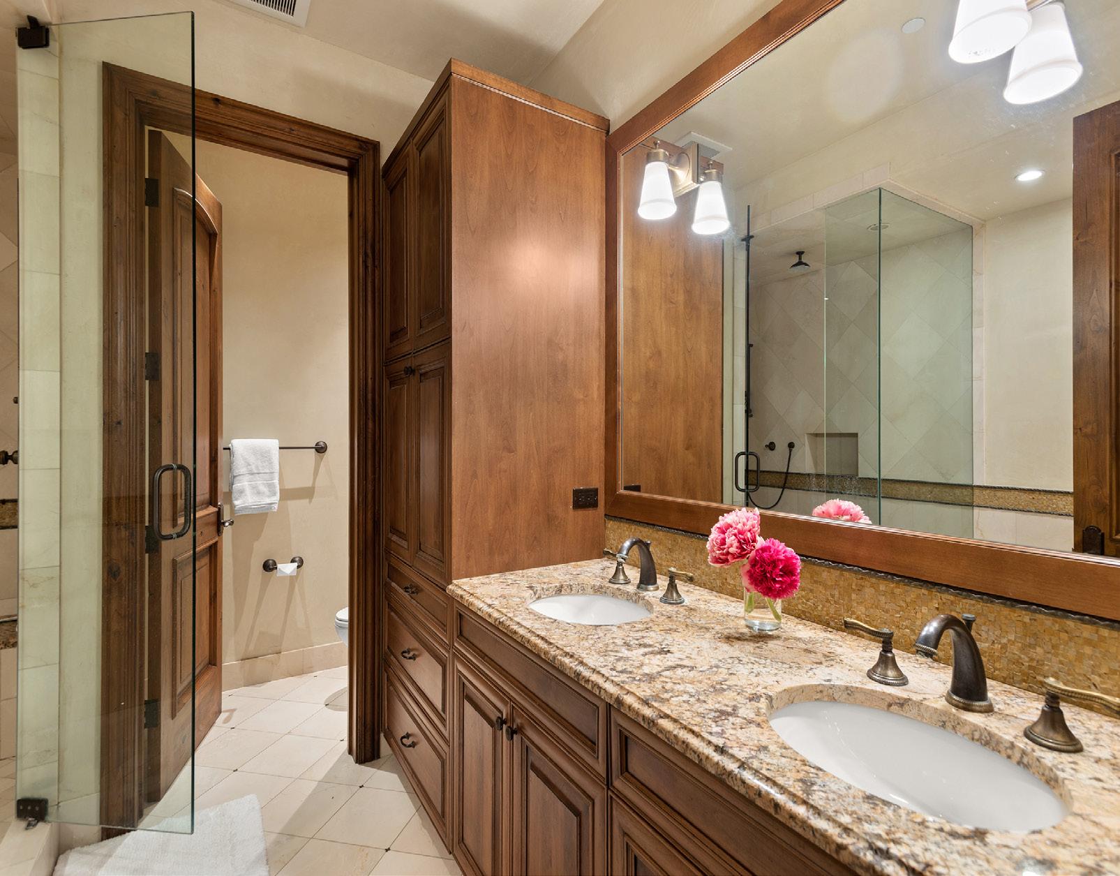 Primary Suite: King Bed with Ensuite Flat Screen TV • Gas Fireplace Private Deck / Patio Walk-In Closet Steam Shower + Jetted Spa Tub Double Vanity + Water Closet Located on Main Level
