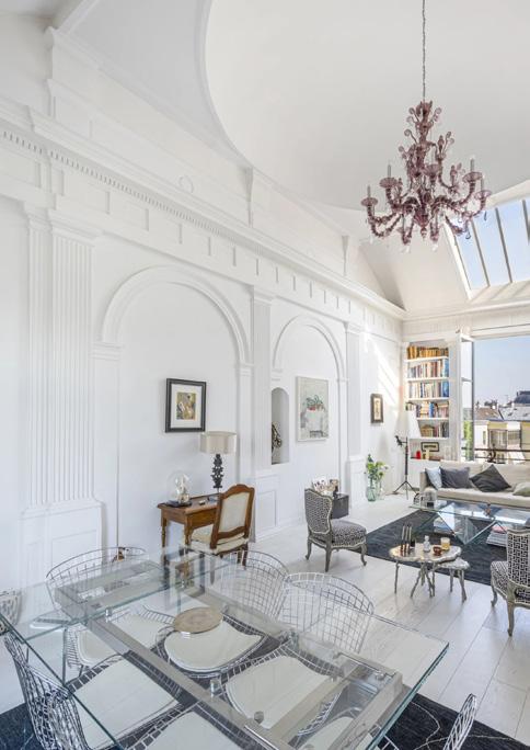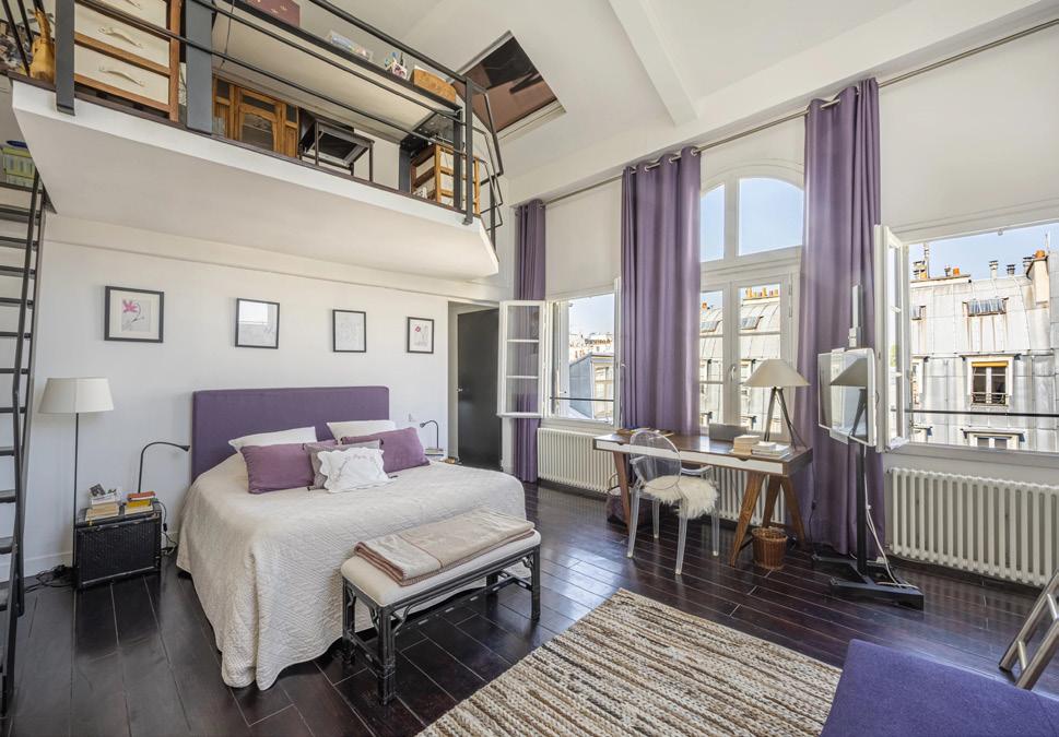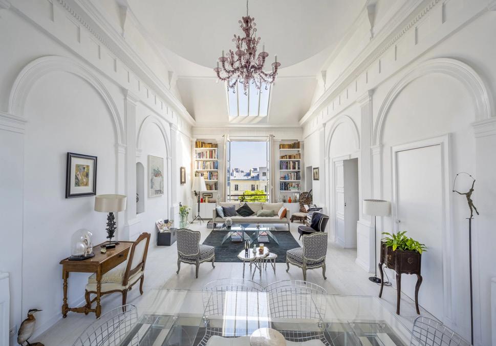 Occupying the top floor of an early 19th-century building, this dual-aspect 1,830 sq ft (170 sq m) apartment offers an entrance hall, a 40 sq m (431 sq ft) living room with 6 m (20 ft) high ceilings, a kitchen, and three suites (one with a study), and lovely garden views.