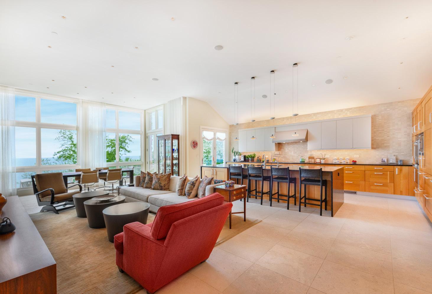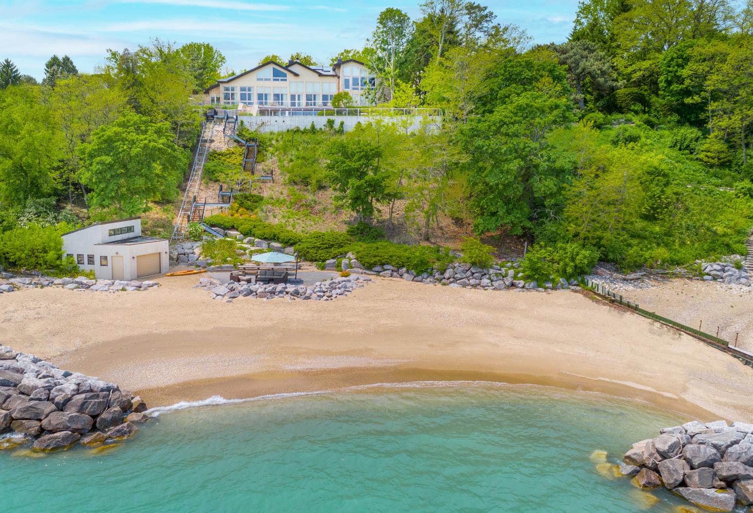 Elevated design meets effortless sophistication at this stunning contemporary overlooking Lake Michigan. Completely updated for today’s lifestyle, this expansive home offers over 200 feet of private sandy beach, a restored bluff and retaining wall, boathouse, and a newer metal tram and stairway to the shore. Exceptional amenities include two offices, a pet spa, an expansive walk-out lower level with sun porch and second kitchen, and an elevator, all in a coveted lakefront setting.