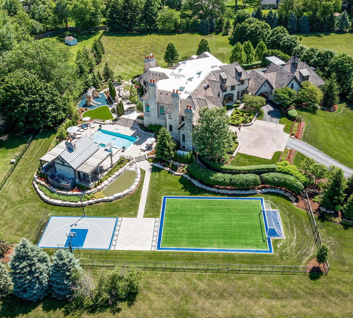 This luxury Midwest estate on nearly 3 acres (1.2 ha) offers exceptional craftsmanship and amenities throughout. Highlights include custom finishes and artwork, an onyxfloored elevator, skylights, a chef’s kitchen, seven en suite bedrooms plus a private-entry duplex, theater, spa, fitness studio, and resort-style outdoor spaces. Offered at $8,900,000