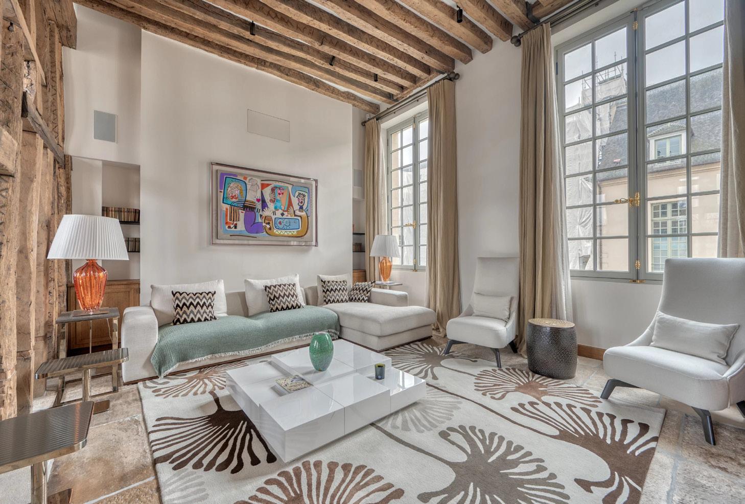 Situated within a 17th-century private mansion a stone’s throw from iconic rue de Bièvre, this air-conditioned 3,864 sq ft (359 sq m) triplex apartment commands magnificent views of Notre Dame Cathedral and the Seine. Accessible by elevator, the residence includes a living room with 13 ft high (4 m) ceilings, a sitting room, dining room, kitchen, and two dual-aspect suites (one with a sitting room).