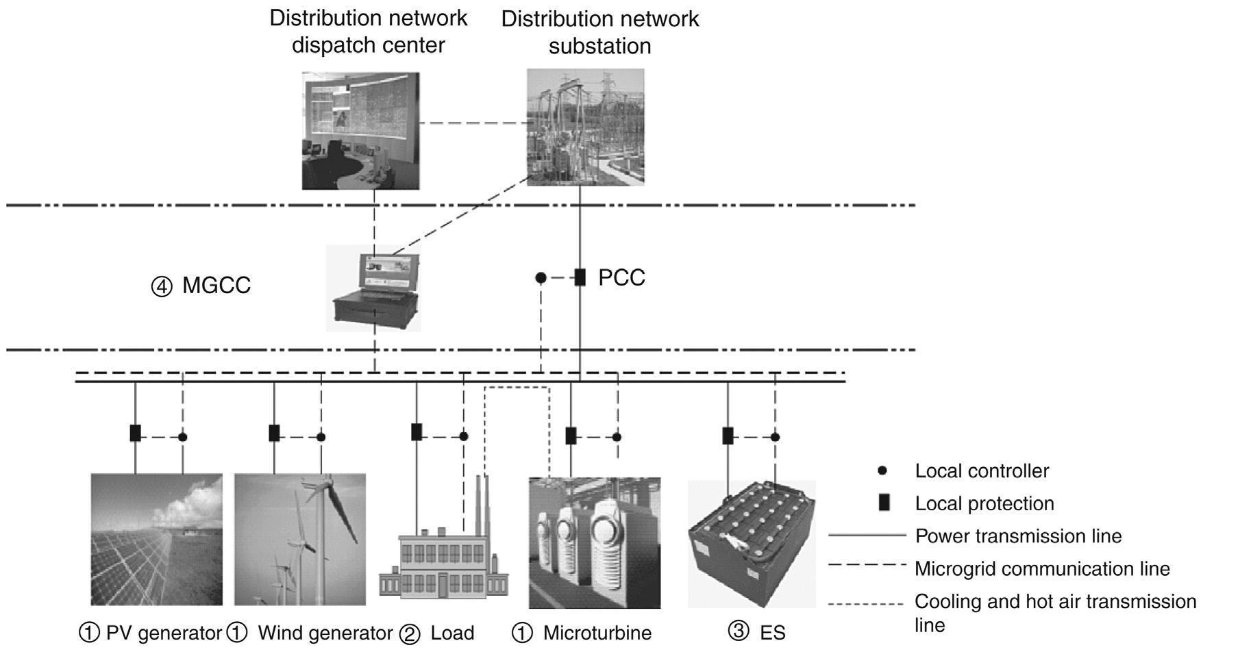 A microgrid can be considered as a small electric power system that incorporates generation, transmission, and distribution, and can achieve power balance and optimal energy allocation over a given area, or as a virtual power source or load in the distribution network. Also, it can consist of one or more virtual power plants (VPPs) to meet the demand of a load center, which can be important offices, factories, or remote residences where the traditional way of electricity supply is expensive. Compared with traditional transmission and distribution (T&D) networks, a microgrid has a much more flexible structure.