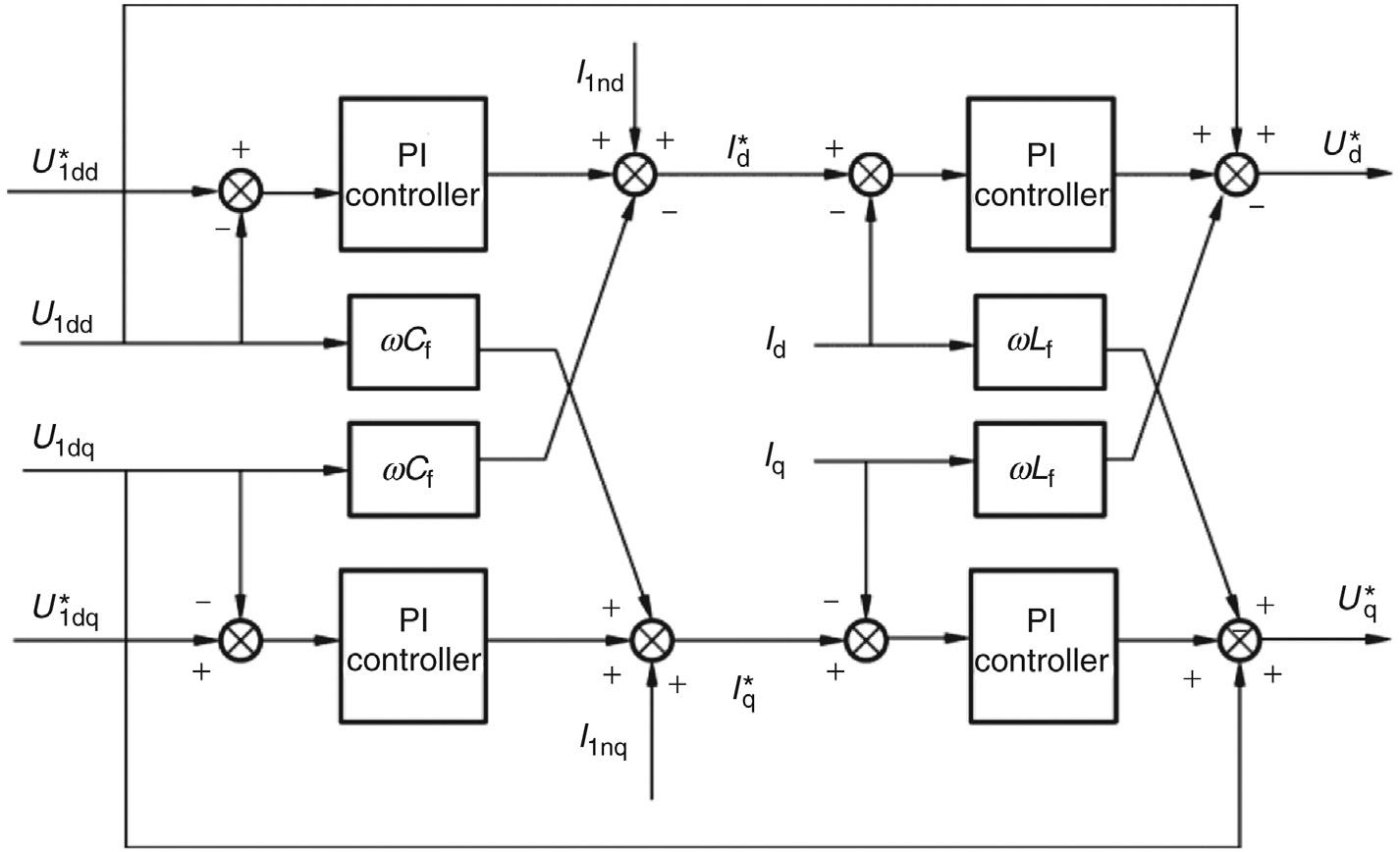 The transfer function between vd1/vq1 and id/iq is a first-order lag, which means that the d-axis and q-axis voltages can be controlled by the d-axis and q-axis currents. On this basis, the inner-loop current controller, usually PI controller, can be designed. Its mathematic model is expressed as follows: