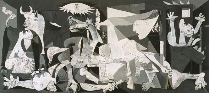 enlarged to monumental scale. You ‘read’ it from right to left, taking in everything from the bull that looms over a screaming mother cradling her dead child to the terri ed horse and the fallen gure holding a broken sword.
