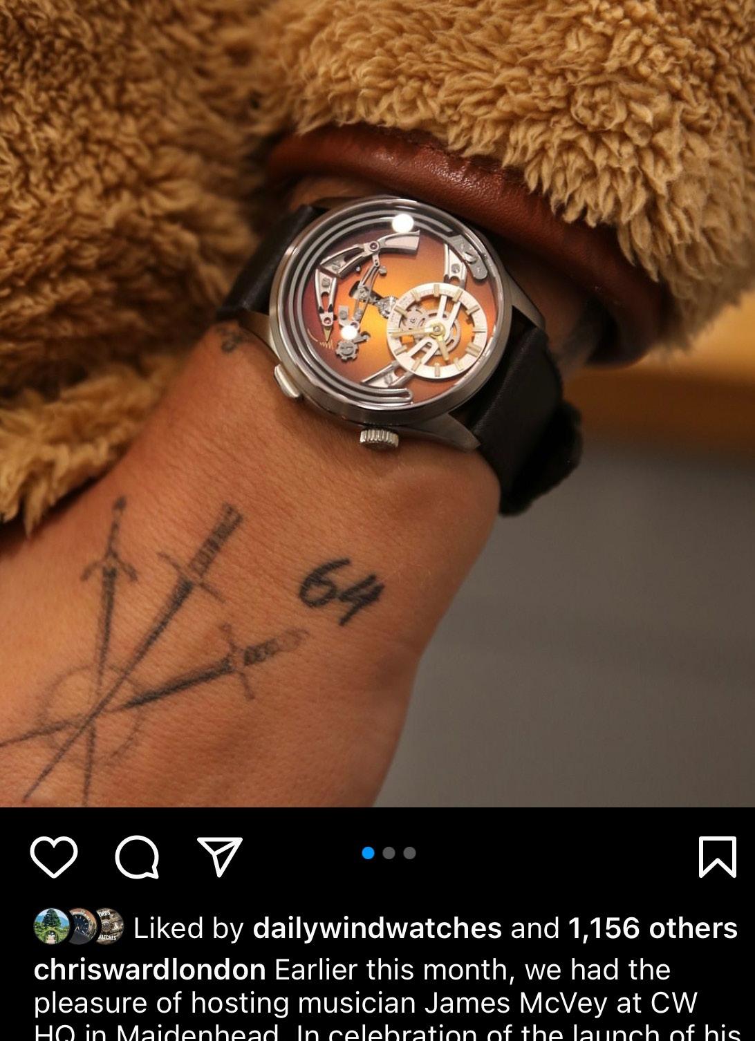 My father-in-law had a few CW watches which I borrowed. But the rst I owned was the Bel Canto that I worked on. As a musician, I thought the sound element to the Bel Canto was interesting. I was pally with Patrick [Gilbertson (CW’s PR manager] and asked if I could borrow a Bel Canto for the ‘10 Years of The Vamps’ concert at the Albert Hall. Afterwards, I sent a message to Mike France, asking if he’d consider working on a unique piece with the dial based on one of our guitars, a Gibson 339. He did, and in return, I gave CW the Gibson to hang in the o ce.
