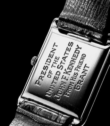 Back to Kennedy: in 1962, he received a Hamilton, an appropriately American watch, with likenesses of his two children engraved on the dial, from David Lawrence, then governor of Pennsylvania. On their fourth wedding anniversary, Jacqueline gave JFK a Cartier, re ecting her taste for the seriously chic; he was wearing this when assassinated. But Kennedy’s most famous watch is one he never wore.