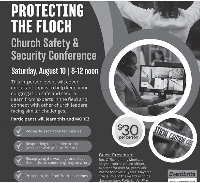 Church Safety and Security Conference will be held on Saturday, August 10th 8 a.m. - 12 noon (in person) at Union Missionary Baptist Church located at 500 S. Martin Luther King Jr Blvd Lansing, Michigan 48915. REGISTER TODAY and receive a 10% Discount on Eventbrite. https://www.eventbrite.com/e/ protecting-the-flock-church-safety-and-security-seminar-tick -