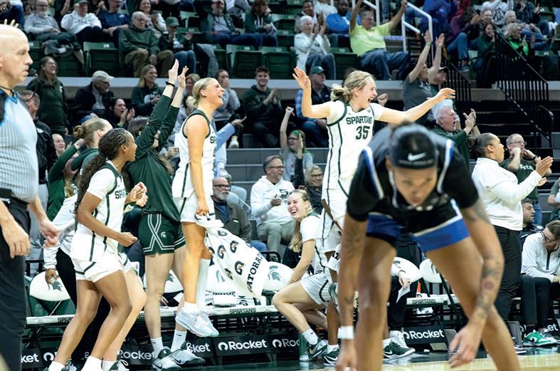 the very end. They came to the Breslin Center with a reputation of playing big, averaging 15 offensive rebounds a game, and ranking eighth best in the nation for second chance scoring. In the first half they dominated us on the boards, much to coach Fralick’s chagrin, but the Spartans rebounded better in the second half and ended with 19 offensive boards of our own. That, paired with 25 forced turnovers, gave MSU 15 more field goal opportunities than Rutgers, which were much needed, because our shooting was off, particularly from deep.