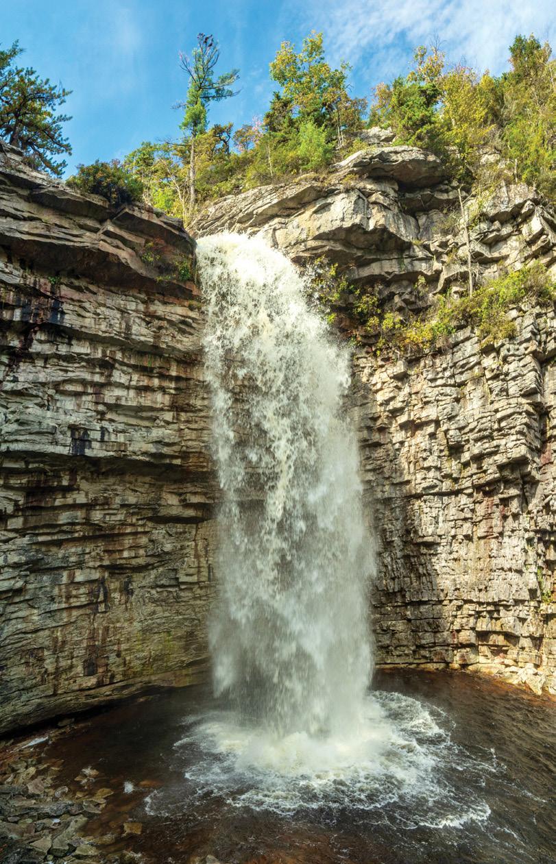 SAM’S POINT AREA, MINNEWASKA STATE PARK At 187 feet, this waterfall is the largest in the area and arguably the most dramatic. A loud whooshing sound heralds the presence of this mighty falls from around half a mile away. Fed by a creek called the Verkeerder Kill, the water courses over giant slabs of rock before heading over a cliff, where it has carved an enormous ravine below. Two large rocks at the end of the footpath, across the ravine from the falls, make an excellent viewing spot.