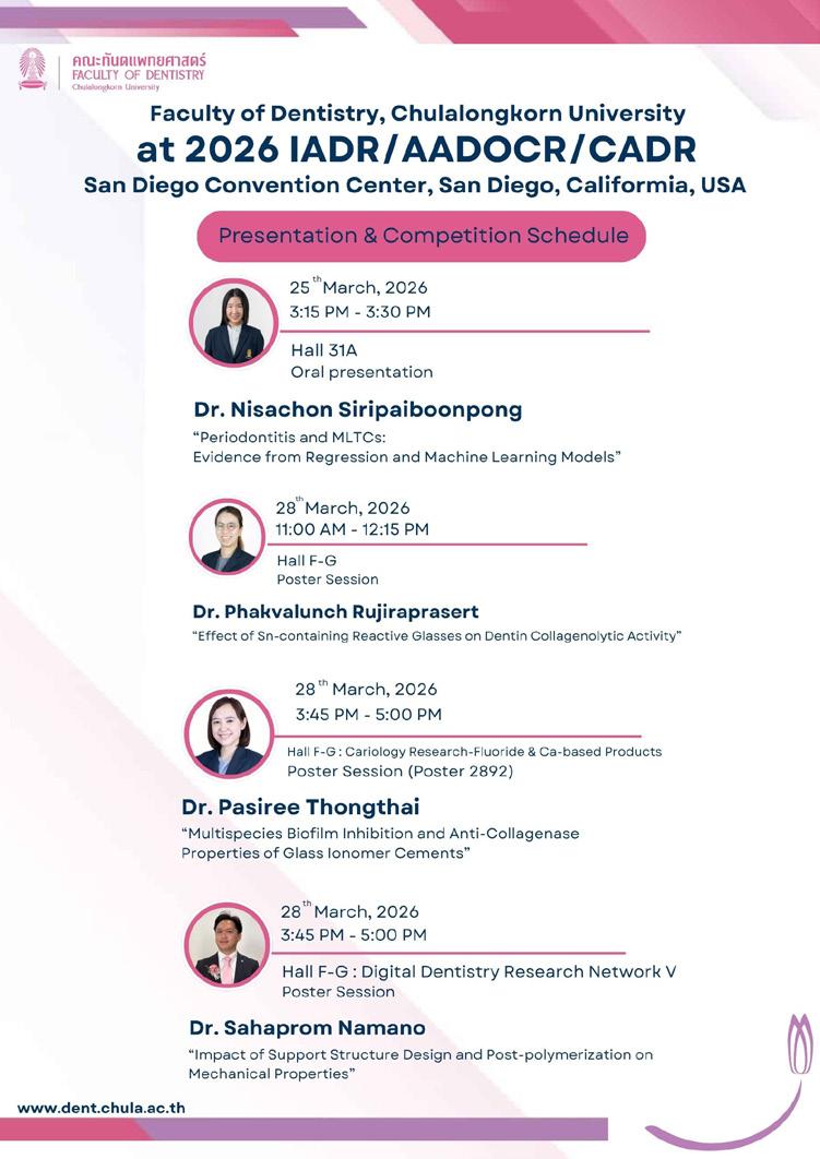 Faculty of Dentistry, and Prof. Dr. Thantrira Porntaveetus, Associate Dean for Research and Innovation, were honored to serve as Chairpersons. In addition, faculty members and students from the Faculty of Dentistry, Chulalongkorn University actively participated in academic and research presentations, attend-