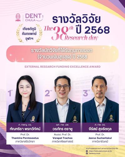 The Faculty of Dentistry, Chulalongkorn University, extends its congratulations on the achievements of its professors, faculty members, and students at the Chulalongkorn University Personnel Recognition Ceremony 2026,held on Wednesday, 11 March 2026, at the Chulalongkorn University Auditorium.