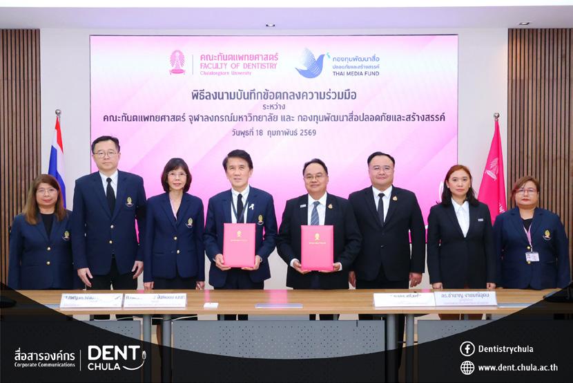 The Faculty of Dentistry, Chulalongkorn University hosted a Memorandum of Understanding (MoU) signing ceremony with the Thai Media Fund (Safe and Creative Media Development Fund) to jointly develop and produce safe, creative media on dentistry and oral health care. The MoU was signed by Professor Dr. Pornchai Jansisyanont, Dean of the Faculty of Dentistry, Chulalongkorn University, and Associate Professor Dr. Rangsima Sakoolnamarka, Vice Dean for International Affairs, Corporate Communications, and Social Engagement, together with Dr. Thanakorn Srisuksai, Manager of the Thai Media Fund, and Dr. Chamnan Ngammaneeudom, Deputy Manager of the Thai Media Fund, with senior executives and