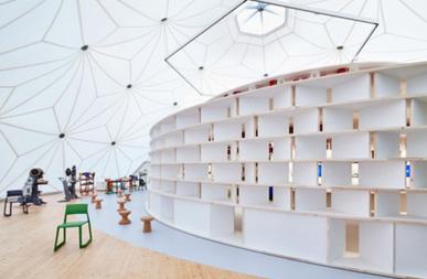 The design had to fit into the existing geodesic structure without competing with it. The solution was to create two concentric layers of self-supporting shelves placed inside the dome like a Russian doll.