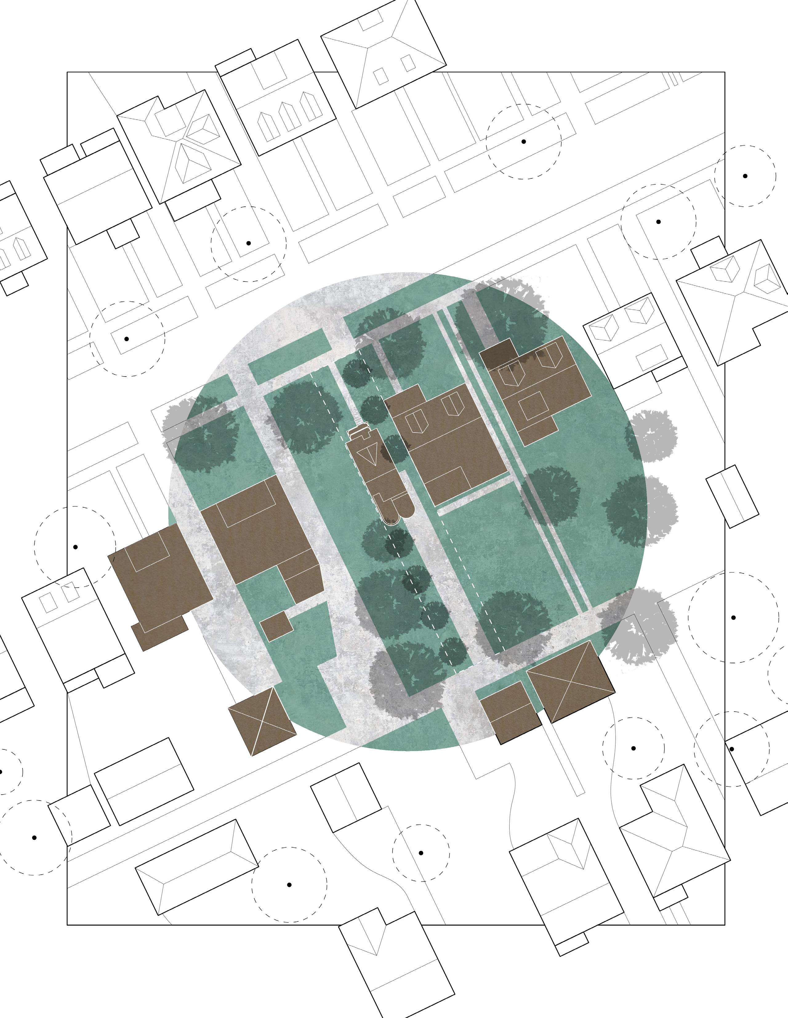 Residing pollutants leach out into and contaminate the lake which flows directly into the Mississippi River. From here I was able to use offsets from the water’s edge to organize strips of plots that would create a hierarchy of pathways for visitors to transverse between. These strips would also be flexible enough to bend around existing trees and create pockets for patron activity. The basic site strategy of offsetting plot strips is visualized above. Strips are divided where sharp corners in the offsets are located to create pathways from the edge of the remediated area inward. A road and bike path surround the remediated area for visitors and service vehicles to travel on. The site is also divided by a road and raised walkway above which creates access to the center of the remediation and location of my building.