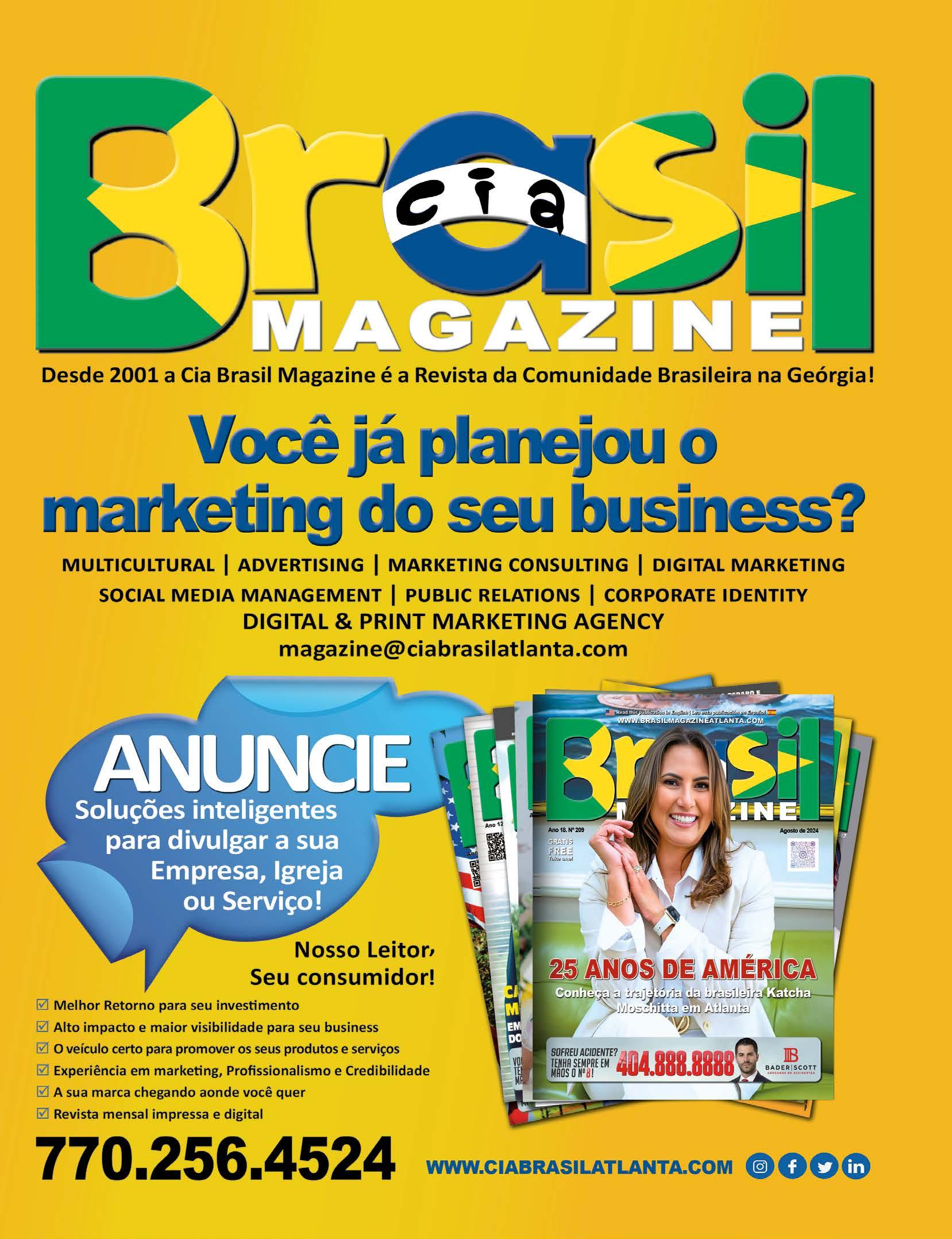 Leia este Editorial, assim como todo o conteúdo desta revista traduzido para o Inglês e para o Espanhol em nosso portal online. Cadastre-se para receber notícias de imigração, educação, economia, cultura, business, beleza, calendário de eventos entre outros conteúdos. Cadastrese pelo nosso website ou por Email: magazine@ ciabrasilatlanta.com e Visite nossos perfis no facebook. Follow us: @Cia Brasil Magazine Ig: BrasilMagazineAtlanta WWW.BRASILMAGAZINEATLANTA.COM