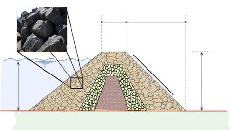 El rompeolas poniente (véase figura 3) incluye en su corona una vialidad de doble sentido para autotransporte y una vía de ferrocarril para el movimiento de mercancías desde y hacia la terminal, adosada al rompeolas. Su estructura está hecha de núcleo y dos capas de 8 millones de toneladas de roca basáltica y una coraza con una capa de elementos de concreto de altas especificaciones de 9 toneladas en el arranque, de 15 y 18 toneladas en el cuerpo y 24 en el morro. La ventaja que tienen estos elementos artificiales respecto de otras formas comúnmente usadas –bloques de concreto y tetrápodos, por ejemplo– es que se colocan en una sola capa y no en dos, como los inmediatamente antes mencionados. La razón de ello es que, por su geometría, forman una especie de red que, por la trabazón lograda, consiguen una mayor resistencia a la acción del oleaje y entonces, con una sola capa y menor peso que otros muy frecuentemente empleados, se logran reducciones en el costo de poco más del 40 por ciento.