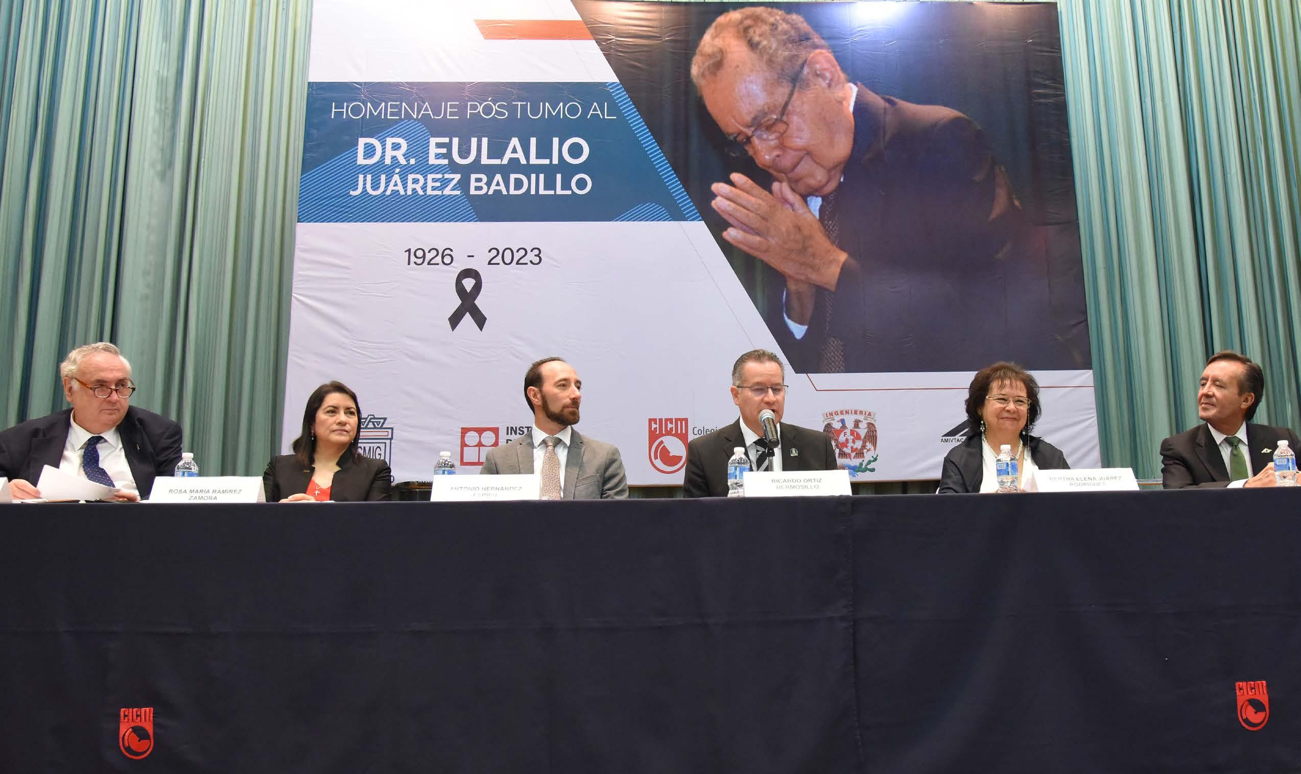En el Auditorio “Enrique Lona Valenzuela” del CICM se llevó a cabo el Homenaje Póstumo al Dr. Eulalio Juárez Badillo. En el presídium: Mtro. Jorge Serra Moreno, Dra. Rosa María Ramírez Zamora, Dr. José Antonio Hernández Espriú, Ing. Ricardo E. Ortiz Hermosillo, Bertha Elena Teresita del Niño Jesús Juárez Rodríguez y el Ing. Salvador Fernández Ayala.