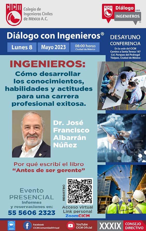 El lunes 8 de mayo se llevó a cabo en la sede del Colegio de Ingenieros Civiles de México la sesión de Diálogo con Ingenieros: “Ingenieros: Cómo desarrollar los conocimientos, habilidades y actitudes para una carrera profesional exitosa”, con la presentación del DR. JOSÉ FRANCISCO ALBARRÁN NÚÑEZ, autor del libro: “Antes de ser gerente”, en el que concentra sus experiencias de más de 50 años de trayectoria y trata sobre las competencias que pueden convertir a un joven profesionista en una persona con una carrera reconocida y exitosa.