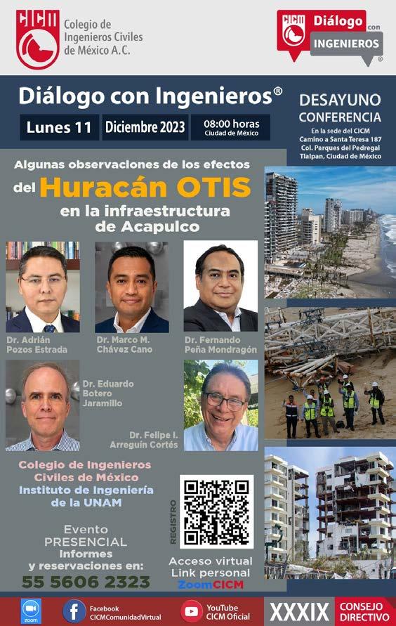 El MTRO. JORGE SERRA MORENO, Presidente del XXXIX Consejo Directivo del CICM, destacó que “cadaexperienciaenrelaciónalosdesastresnaturales,nosenseña leccionessobrelavulnerabilidad.Debemosaprovecharestasexperienciasparafortalecer la seguridad de nuestras edificaciones, la infraestructura y los servicios esenciales de agua, energía, transporte, salud, producción y distribución de alimentos, entre otros”. Agregó que “vivimosenunmomentoenelquelaIngenieríaCivilestállamadaajugar un papel fundamental en la creación de soluciones que promuevan la seguridad y el bienestardenuestrascomunidades.LaparticipacióndelosIngenierosCivilespuedeser determinanteenlaplaneacióndeldesarrollourbano,enlaformulacióndenormativasy reglamentacionestécnicas,deemergenciaopermanentes,quefortalezcanlaseguridad estructural y ayuden a proteger a la población y a los sectores productivos, como la industria turística en el caso de Acapulco”.