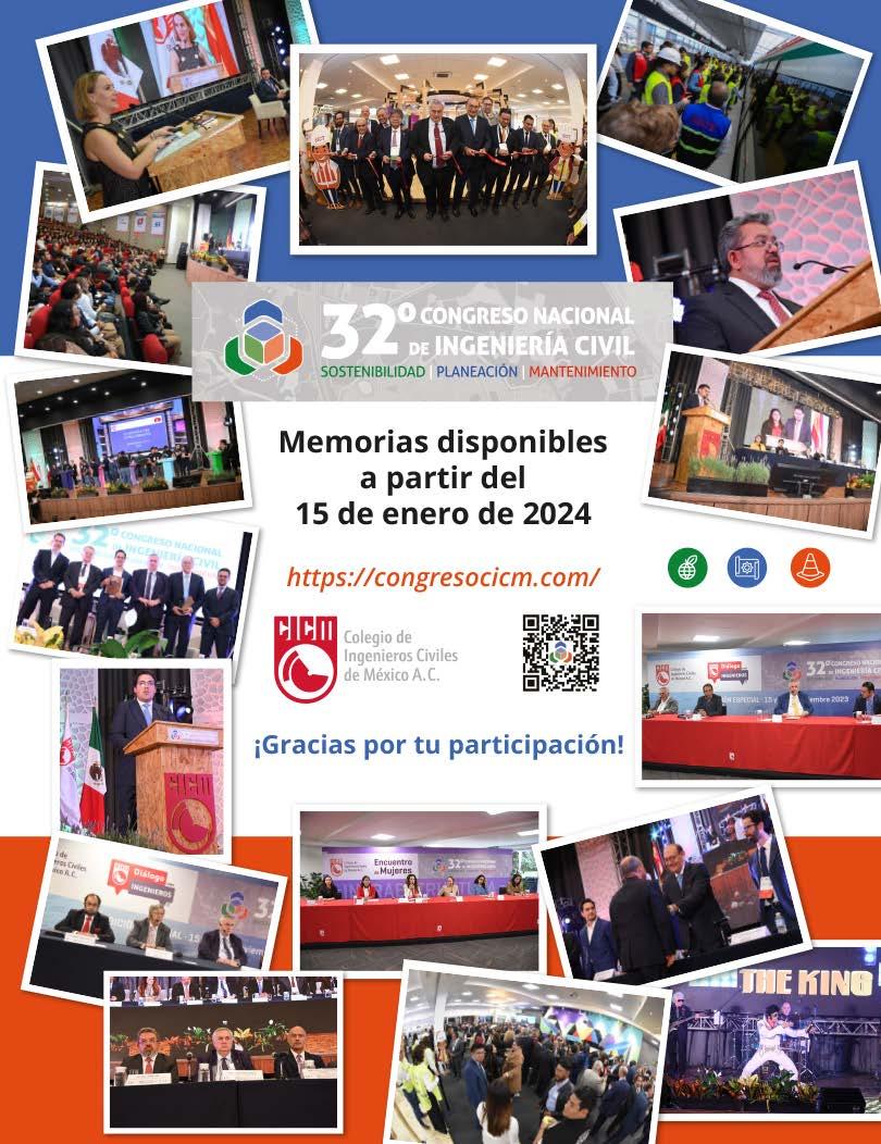 Del 14 al 16 de noviembre se llevó a cabo en la sede del Colegio de Ingenieros Civiles de México, A.C., el 32º Congreso Nacional de Ingeniería Civil (CNIC), cuyos ejes rectores fueron Sostenibilidad / Planeación / Mantenimiento, y en el que se dieron cita funcionarios de México y España, ingenieros civiles y profesionales relacionados con la planeación, construcción, operación y conservación de la infraestructura, académicos, estudiantes y público en general.