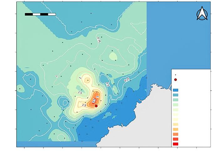 Figura 6. Mapa de la concentración de sal alrededor de la descarga de salmuera de la planta desalinizadora Minera Escondida, Chile.
