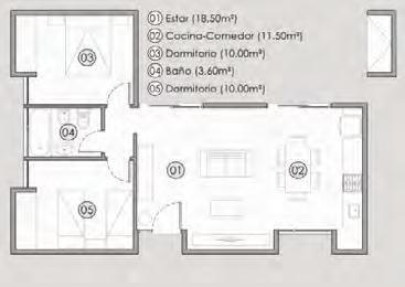 El ingreso se da por el piso 3, donde se encuentran las áreas sociales y las terrazas con parrilleros. El área íntima se conecta por una escalera interna. En esta planta alta se encuentran los dormitorios, vestidores y baños.