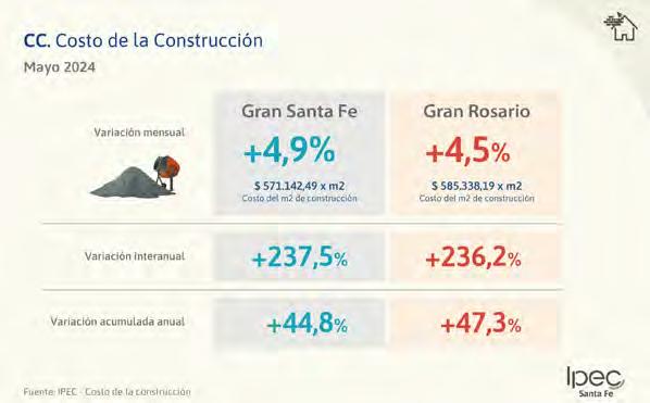 El nivel general del costo de la construcción (CC) en el aglomerado Gran Santa Fe correspondiente a mayo de 2024 registra un aumento de 4,9%, en relación al mes anterior, como consecuencia del alza de 1,1% en el capítulo “Materiales”, de 11,0% en el capítulo “Mano de obra” y de 2,2% en el capítulo “Gastos generales.”