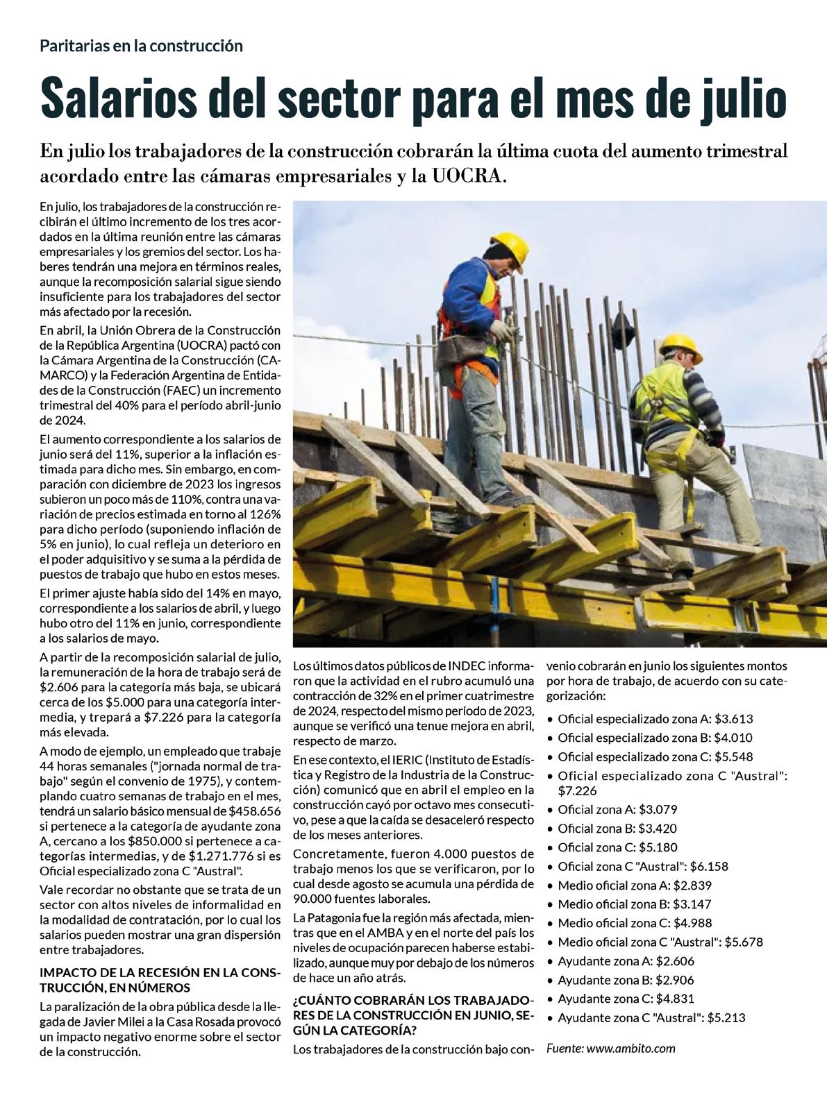 La Unión Obrera de la Construcción de la República Argentina (UOCRA) y la Cámara Argentina de la Construcción (CAMARCO) firmaron un nuevo aumento y escala salarial para trabajadores de la construcción actualizado el sábado 27 de abril de 2024 a las 10:45. La UOCRA anunció un incremento salarial para trabajadores de la construcción del 40,46% a pagar en tres veces del 14%, 11% y 11%, para los meses de abril, mayo y junio 2024, respectivamente.