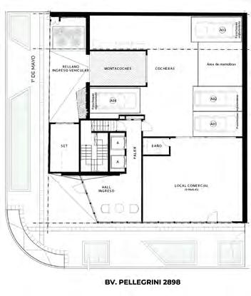 En planta baja sobre Bv. Pellegrini se encuentra el Hall de acceso al edificio y un Local comercial y, sobre calle 1º de Mayo, se sitúa el montacoches que permite el ingreso a 18 cocheras ubicadas en el basamento del edificio.