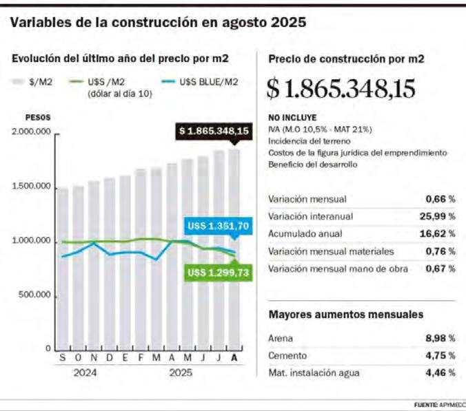 del 36,8% que registra la mano de obra, pero su impacto en el mes fue determinante para el índice general de la construcción en Mendoza. En valores absolutos, el informe detalla que el metro cuadrado de una vivienda económica en Mendoza alcanzó los $1.139.031, mientras que el de una vivienda de mediana calidad se ubicó en $1.510.238.