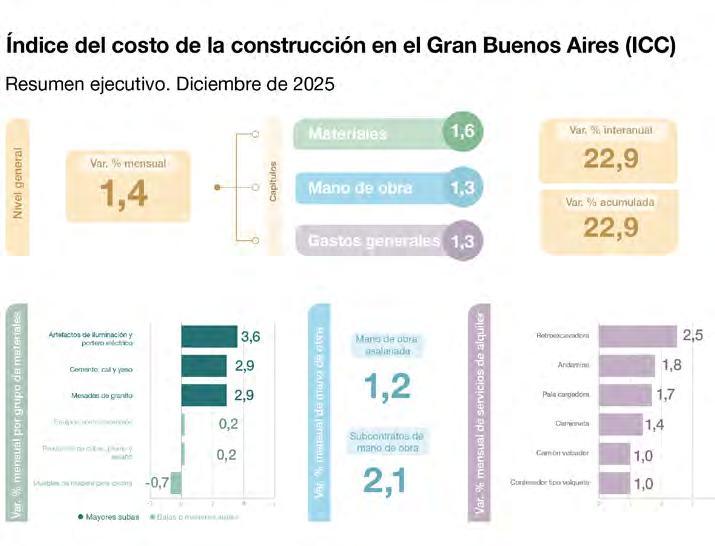 consumos y conexiones de agua y cloaca, al tiempo que el Ente Nacional Regulador del Gas (Enargas) dispuso actualizaciones para todos los conceptos de conexión de gas. El informe técnico detalló que las variaciones en los precios de los materiales estuvieron asociadas tanto a factores internos del mercado como a la dinámica de contratación y provisión local. Las revisiones salariales y los aumentos tarifarios definieron el comportamiento de los costos durante diciembre y determinaron el cierre anual del indicador. El análisis por rubros de obra permitió observar diferencias en la magnitud de los incrementos. El mayor ajuste correspondió al rubro movimiento de tierra (32,4%), seguido por carpintería de madera (29,4%) y ascensores (31%). Otros ítems, como albañilería (24,4%), carpintería metálica y herrería (27,6%) y otros trabajos y gastos (24,1%), completaron el cuadro de subas más pronunciadas. Por su parte, los aumentos más moderados se identificaron en yesería (16,9%) y pintura (15,7%).