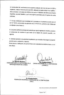 El 12 de enero de 2026, la Unión Obrera de la Construcción de la República Argentina (UOCRA), la Cámara Argentina de la Construcción (CAMARCO) y la Federación Argentina de Entidades de la Construcción (FAEC) llegaron a un acuerdo paritario, el cual fue homologado por la Dirección Nacional de Relaciones y Regulaciones del Trabajo del Ministerio de Capital Humano el 15/01/26, en los siguientes términos: Se establece un incremento salarial que se aplicará a las distintas categorías previstas en el Convenio Colectivo de Trabajo CCT N° 76/75, el cual se otorgará de la siguiente manera: a) Un aumento en el mes de enero de 2026 del 2% (dos por ciento) que se aplicará sobre los salarios básicos vigentes al 31 de diciembre de 2025; b) Un aumento a partir del mes de febrero de 2026 del 1,8% (uno coma ocho por ciento) que se aplicará sobre los salarios básicos vigentes al 31 de enero de 2026. La totalidad de los porcentuales aquí previstos son acumulativos. Asimismo, se establece el pago de una suma mensual, de carácter no remunerativo, pagadera en los meses de enero de 2026 y febrero de 2026 para los trabajadores del mismo Convenio Colectivo, de la siguiente manera: el 50% será abonado juntamente con el pago de la primera quincena del mes del cual se trate y el 50% restante será abonado juntamente con el pago de la segunda quincena de dicho mes. El presente acuerdo salarial tiene vigencia hasta el 28 de febrero de 2026.