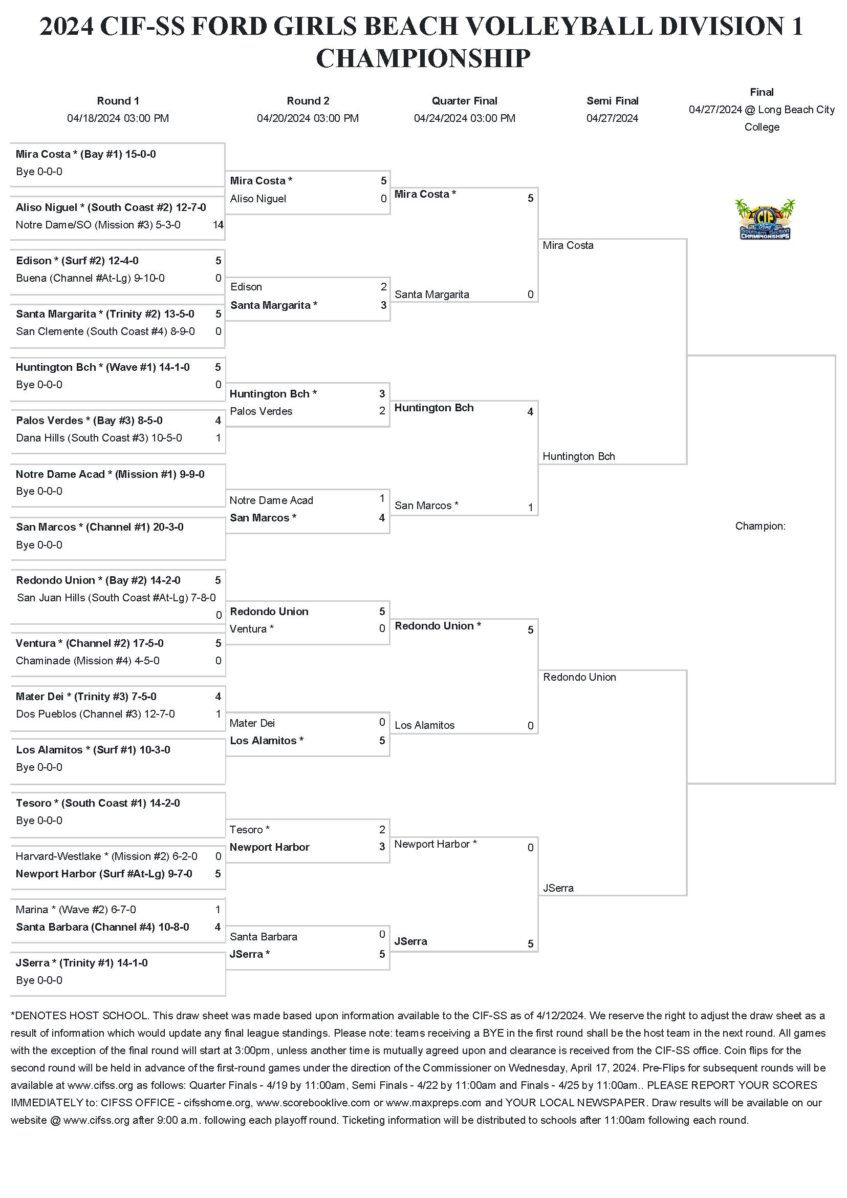SEMI FINAL AND FINAL MATCHES WILL BE PLAYED AT LONG BEACH CITY COLLEGE SAND COURTS ON SATURDAY, APRIL 27, 2024
